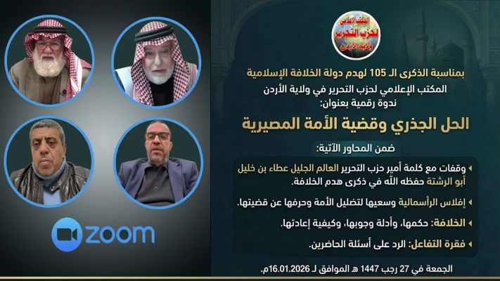 ندوة رقمية بمناسبة الذكرى الـ 105 لهدم دولة الخلافة الإسلامية بعنوان: الحل الجذري وقضية الأمة المصيرية الجمعة في 27 رجب 1447هـ الموافق لـ 16/01/2026م